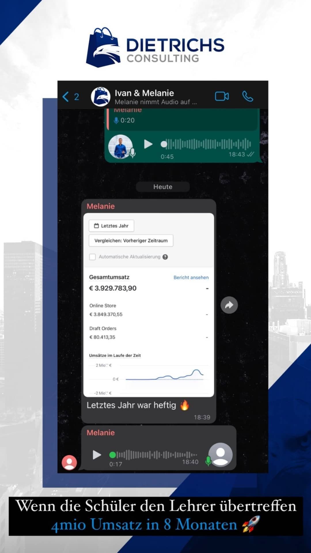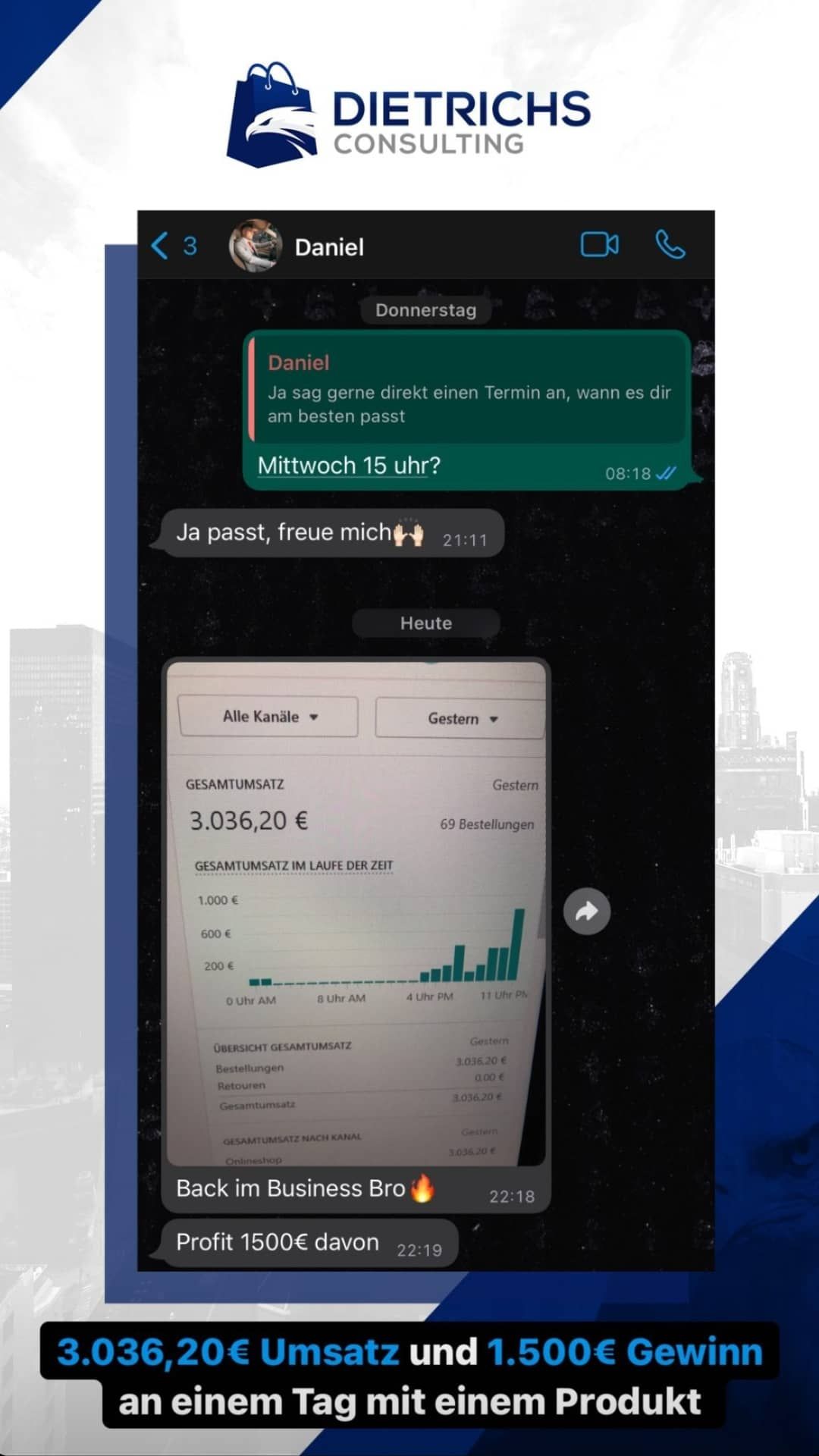 “Ich war auf der Suche nach einem Dropshipping Coach. Andere Coaches haben regelmäßig dieselben Kundenergebnisse gepostet, wobei Mik’s eigene Erfolge und die Vielzahl an Kundenergebnisse im Dropshipping der Grund waren, warum ich mich für ein Coaching bei ihm entschieden habe”